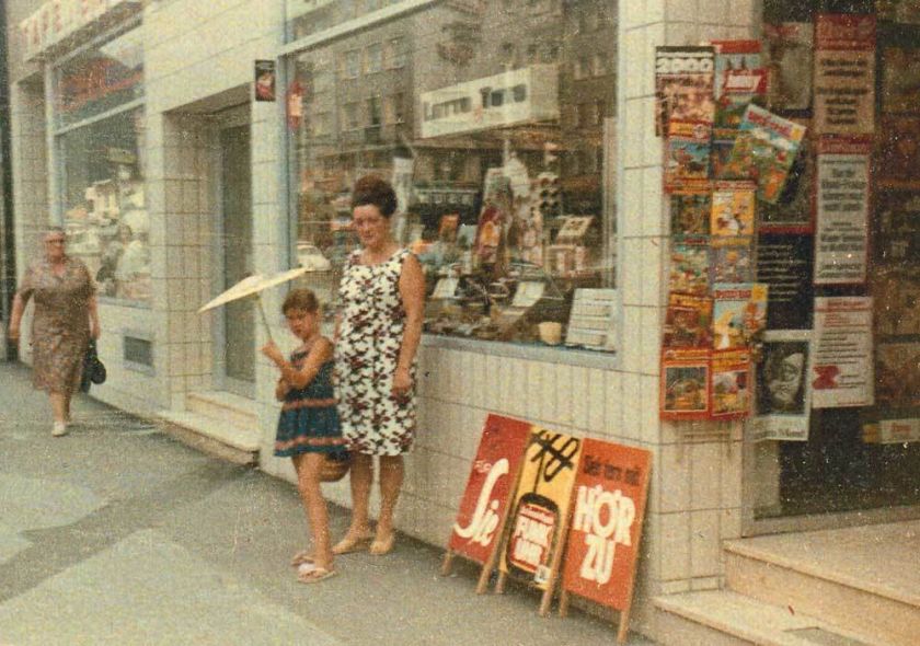 Mein Stammkiosk in Wuppertal-Oberbarmen, geführt von den Eheleuten Koziol. Das Foto ist im Sommer 1969 entstanden sein, zwei Jahre vor meiner ersten Begegnung mit PERRY. Ein PERRY-Heft - wohl der Sammelband 2 - sieht man übrigens im Aushang, zum Teil verdeckt von einem BUSSI BÄR. Ebenso auf die Bild meine beste Freundin Manuela mit ihrer Mutter.