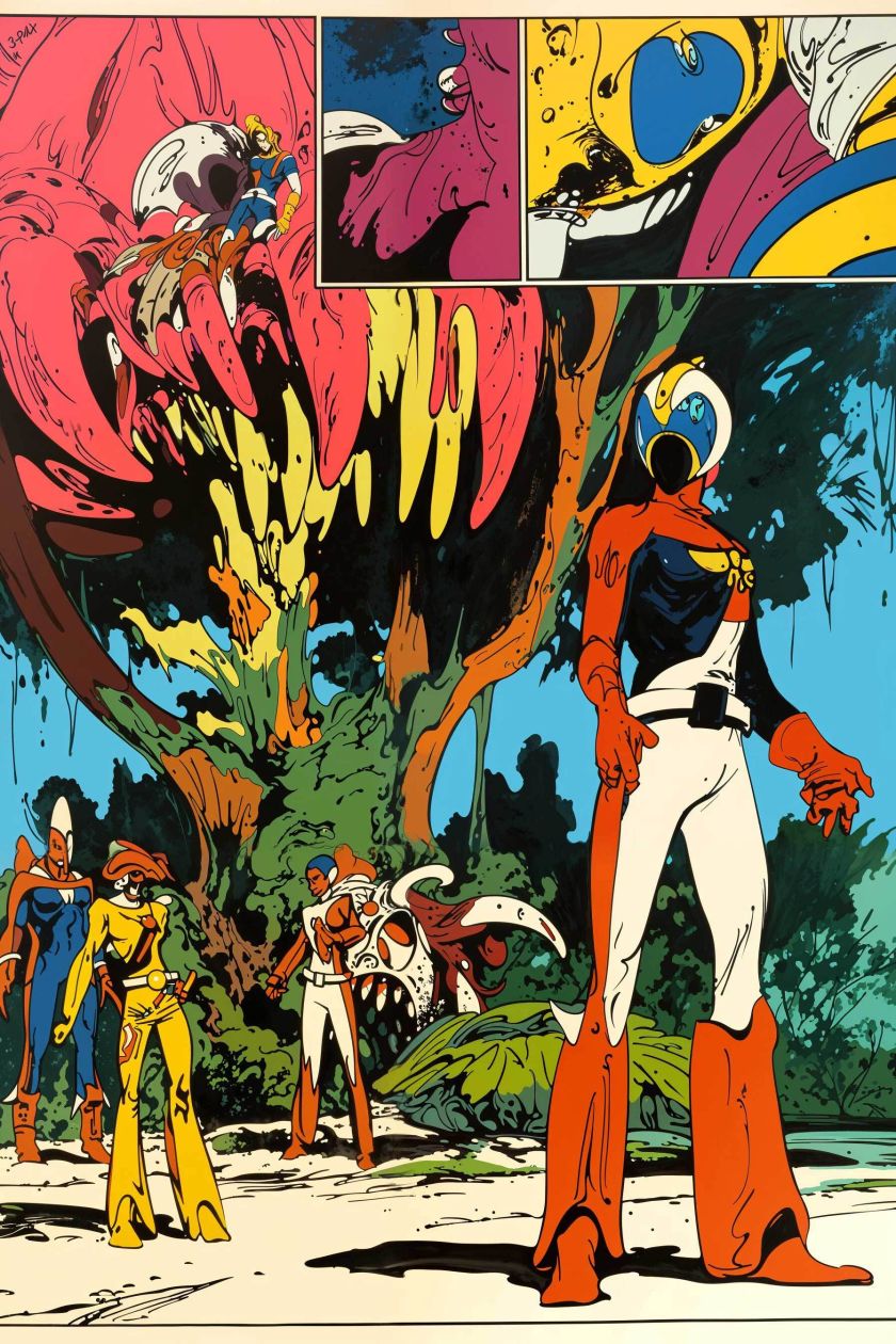 generiert nach Stilvorlagen aus PERRY Nr. 38-43, mit Referenzen auf Esteban Maroto, Heinz Edelmann, Jose Gonzales. niji-Parameter, sref 2526862084, 2526862084. Stil zwar nicht identisch mit Pop-Art-PERRYs, aber farblich und kompositorisch durchaus in der Tradition.