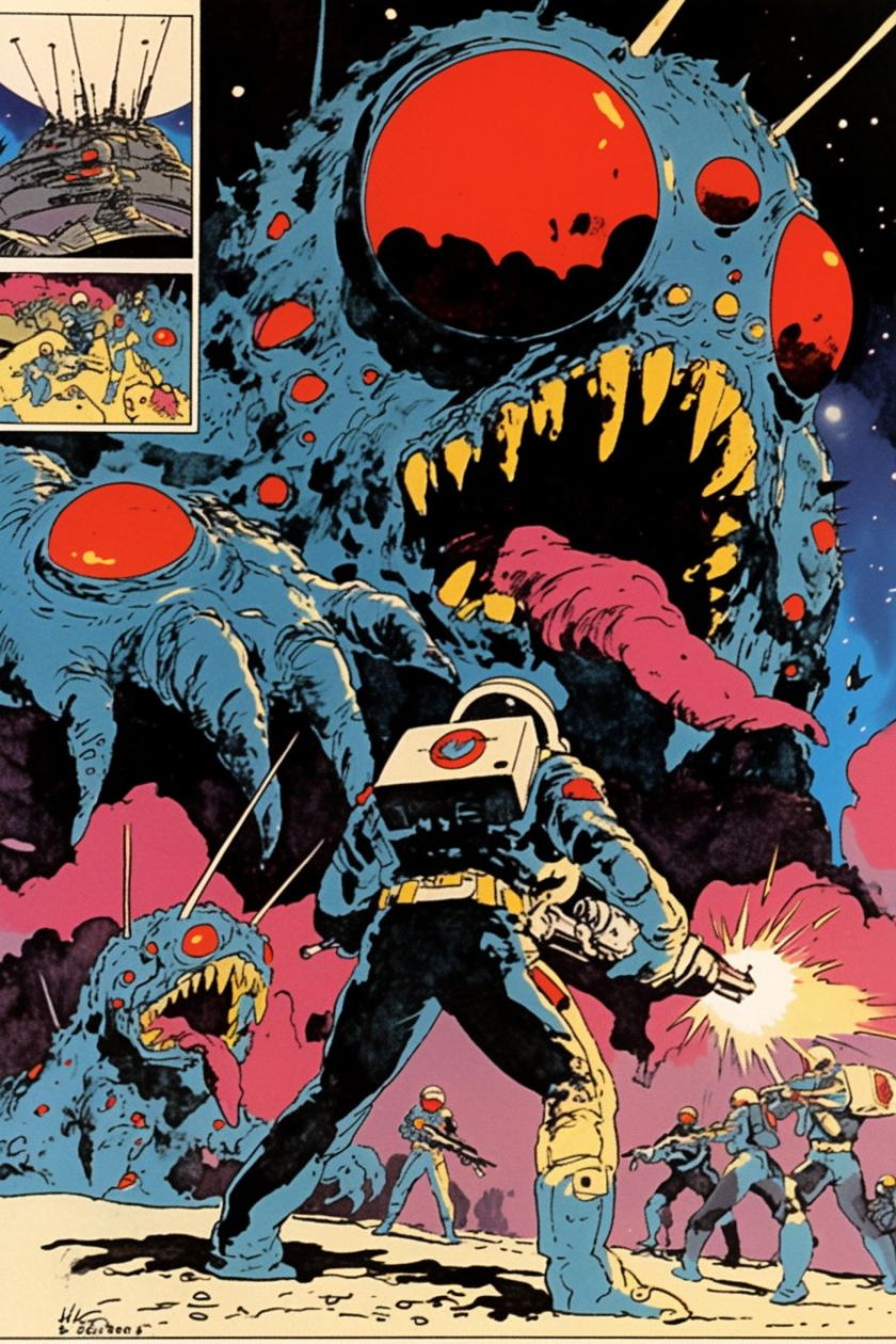 generiert nach Stilvorlagen aus PERRY Nr. 38-43, mit Referenzen auf Esteban Maroto, Heinz Edelmann, Jose Gonzales. niji-Parameter, sref 2526862084, 2526862084. Stil zwar nicht identisch mit Pop-Art-PERRYs, aber farblich und kompositorisch durchaus in der Tradition.